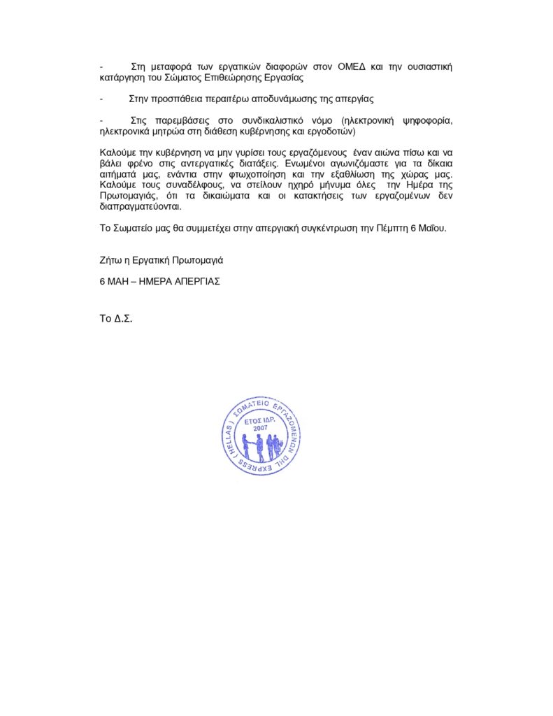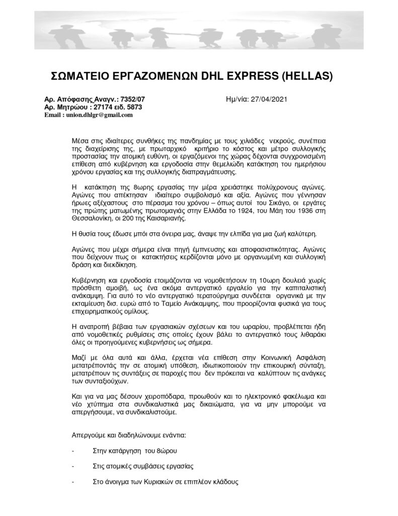 ΣΩΜΑΤΕΙΟ ΕΡΓΑΖΟΜΕΝΩΝ DHL EXPRESS (HELLAS) ΓΙΑ ΤΗΝ ΑΠΕΡΓΙΑ ΣΤΙΣ 6 ΜΑΗ